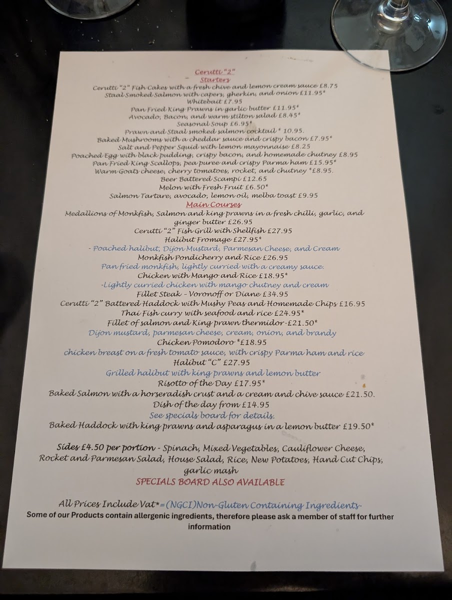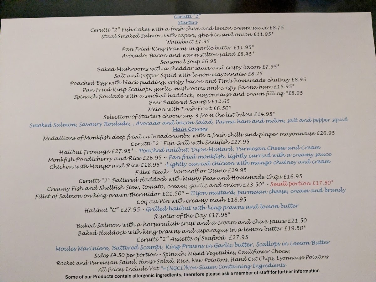 Located conveniently at Station Square, Railway Station, Beverley HU17 0AS, United Kingdom, Cerutti 2 stands out as a refined seafood restaurant that blends tradition with a modern dining experience. Having dined here multiple times, I can confidently say the Cerutti 2 Menu offers a thoughtfully curated selection of fresh seafood, complemented by seasonal ingredients and excellent wine pairings.
